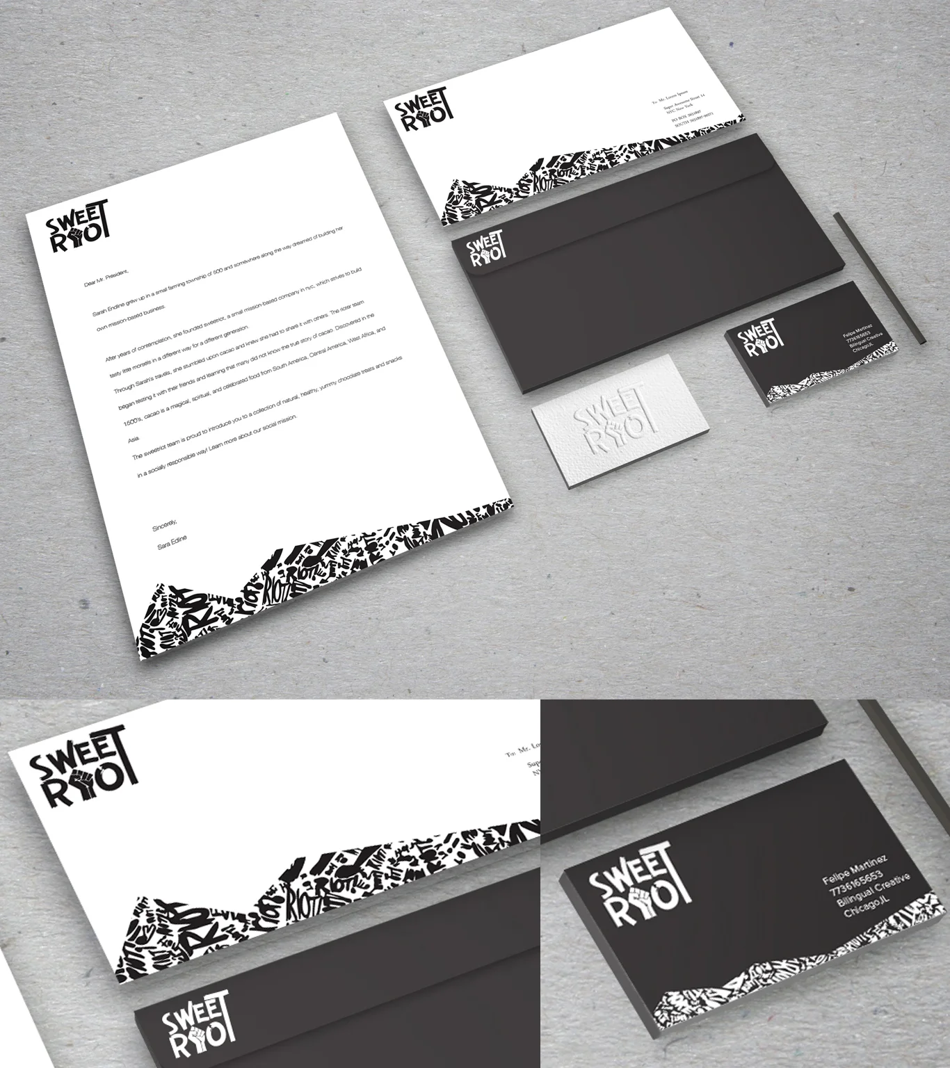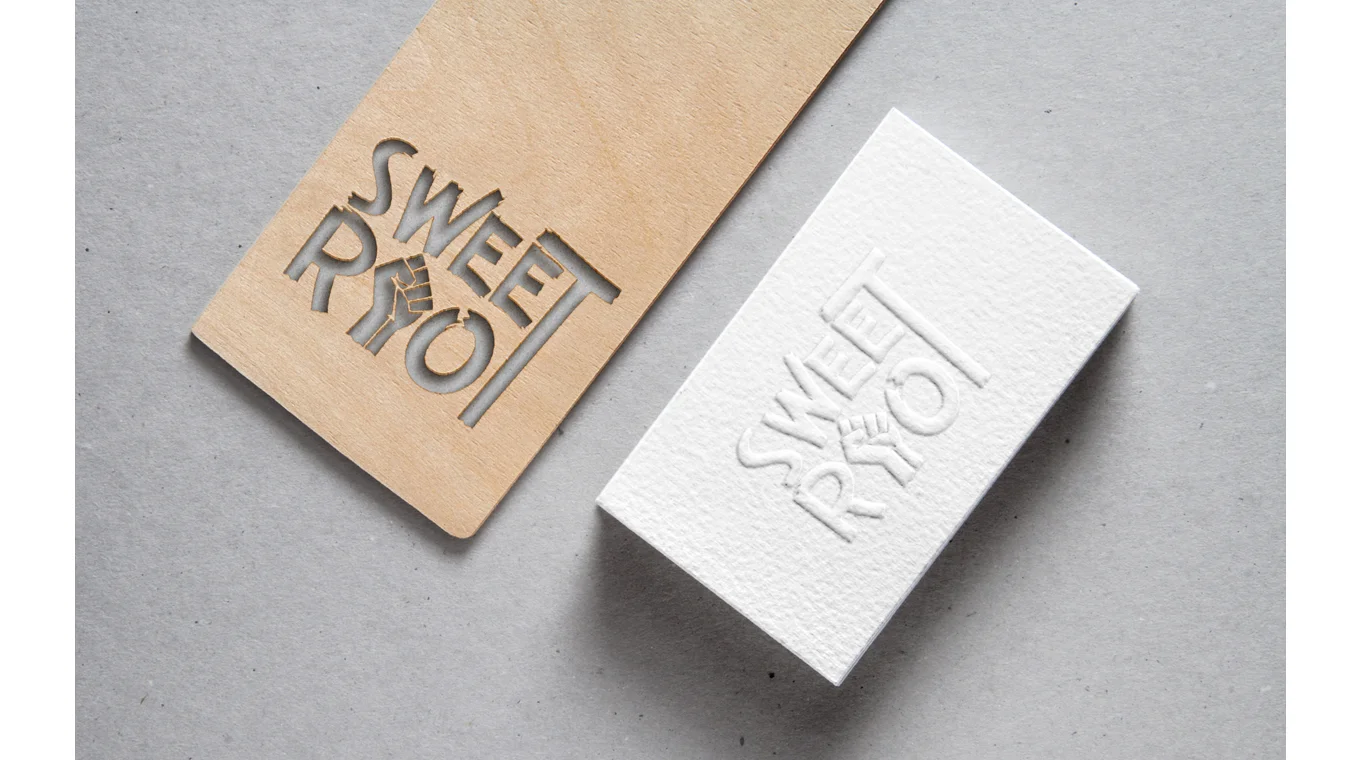 To keep the same revolutionary feel that could translate to every single Sweet Riot object, it was decided to ad a riot pattern for watermarks and business cards. This catalog of office materials can translate that Sweet Riot means business.