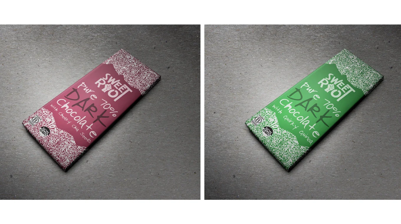 Completely rebrand the look, feel, and marketing strategies that cater to their current needs and expectations from consumers. Sweet Riot is a brand that deeply care about ethical business practices, that said, they only offer products that are Organic and use Fair Trade raw ingredients. They are the Revolution of sweets. They gotta act like it. The new logo and overall design of their products will reflect their values in a more direct way, allowing consumers to understand what they are buying and feel good about their choice.
